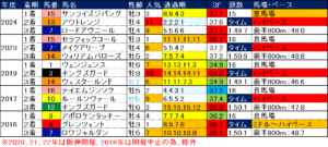 先行争いが激しくなり、前半のペースは速くなる。そのままペースが緩まない厳しい流れになる事が多く、差し馬の戦績が良い。