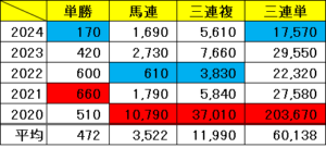 芝部分が外側のほうが約30m長い為、外枠有利なコース形態。過去10年で1枠は一度も馬券になっていない。