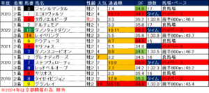 直近5年は前半かなり流れ、タフなレースになっており、上がり3ハロン33秒台の速い末脚が問われる展開にはなっていない。